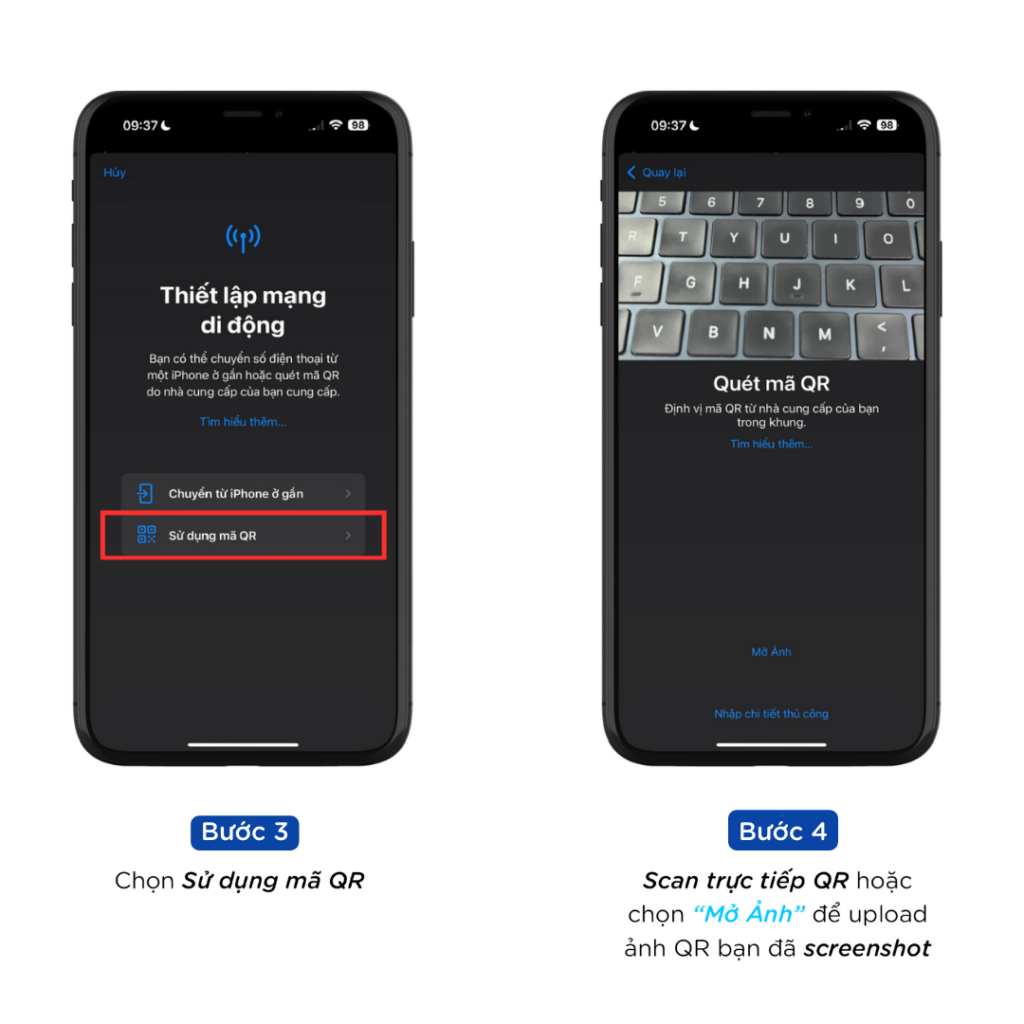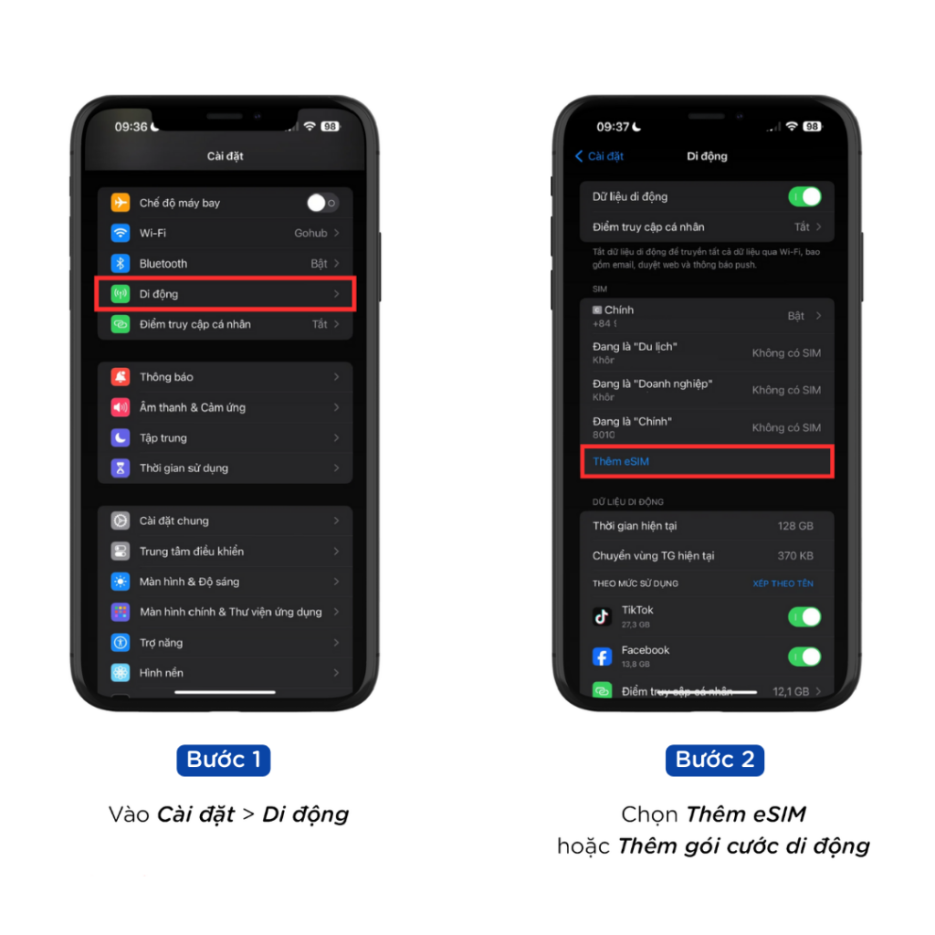 Chọn “Thêm eSIM” hoặc “Thêm gói cước di động”