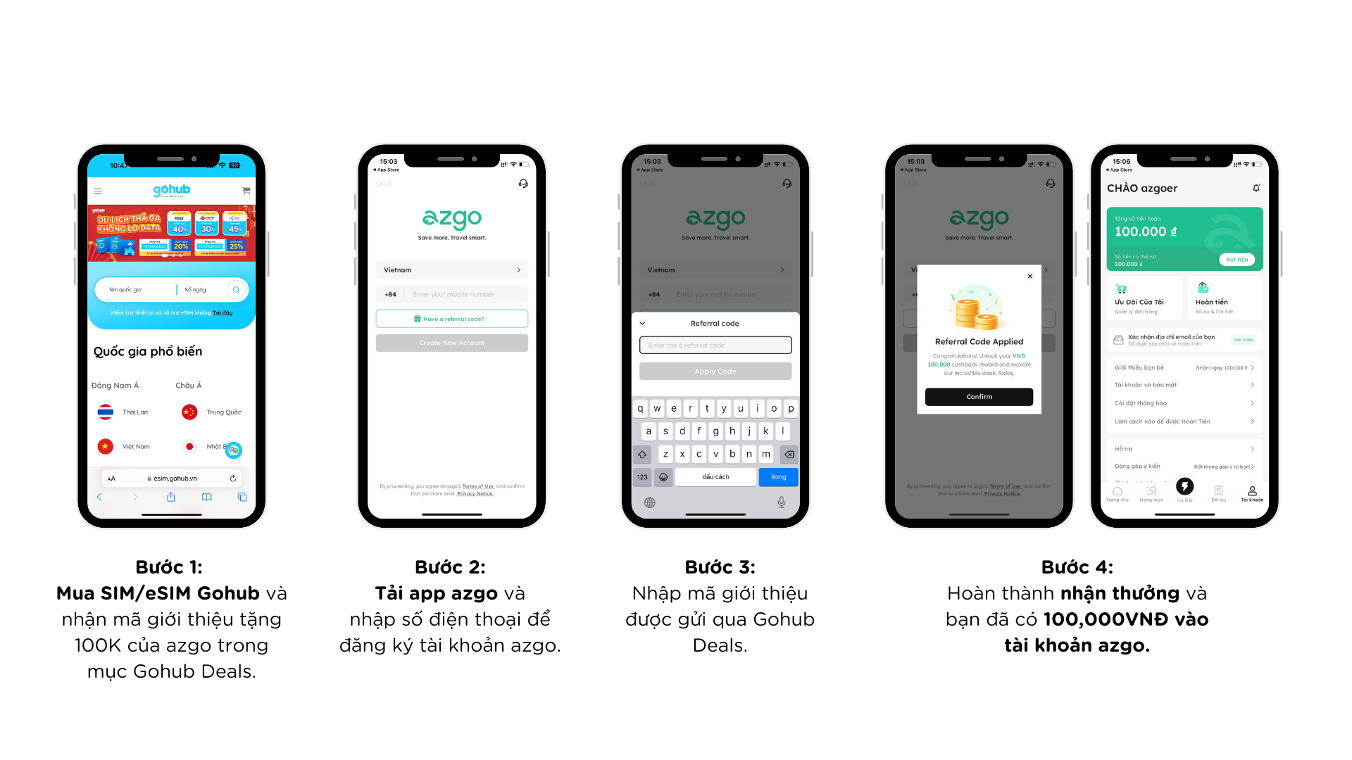 - Nhận ngay 100K: Sau khi đặt SIM/eSIM Gohub, bạn sẽ nhận mã code đặc biệt để được tặng ngay 100K trong ứng dụng azgo.
